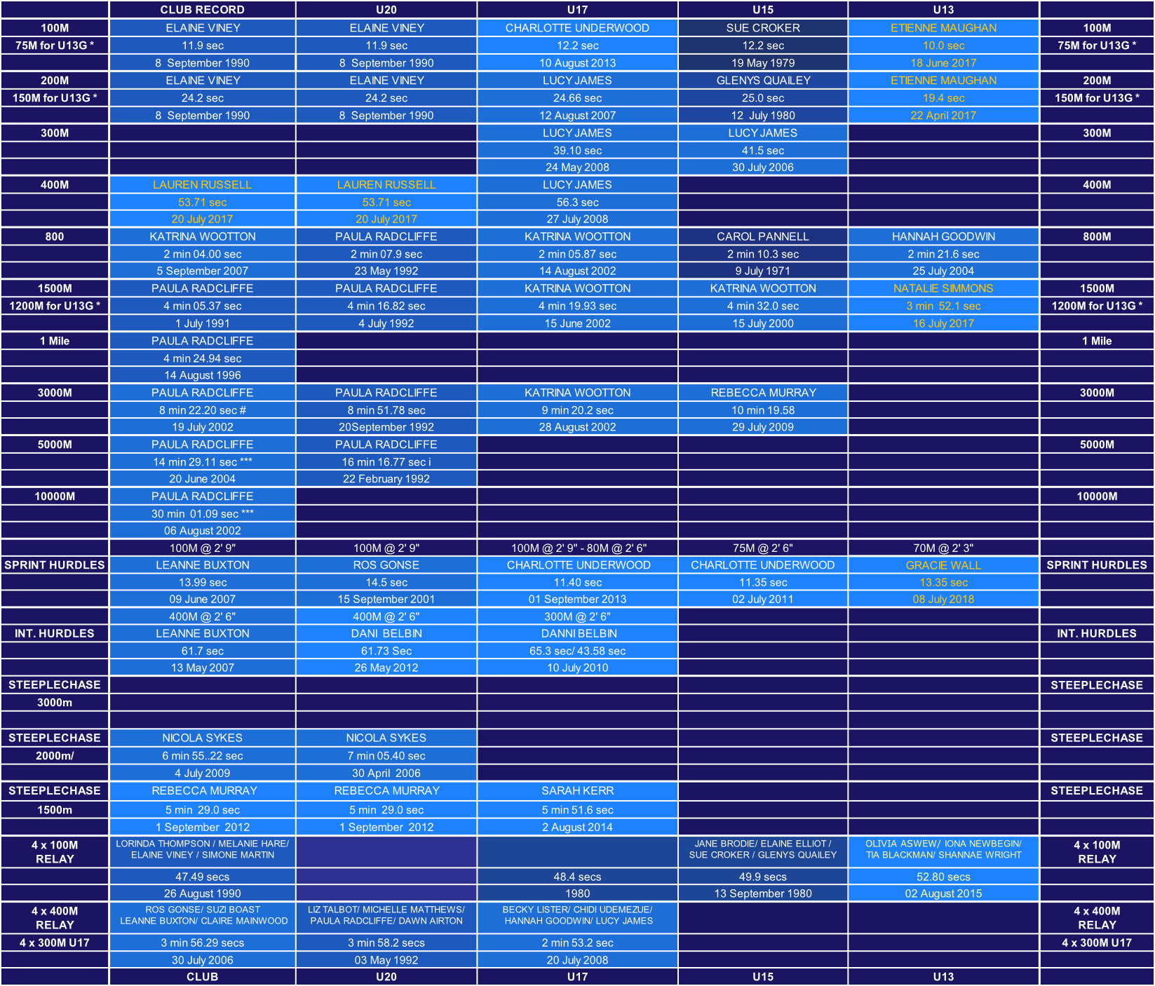 U13 Girls 100m 12.3 Sue Croker 8 July 1978, 200m Sue Croker 26.6 20 May 1978, 1500m Nicola Dilley 4:53.1 21 July 1981 75m H @2’6” Rachel Webb 12.4 sec 2 September 1995